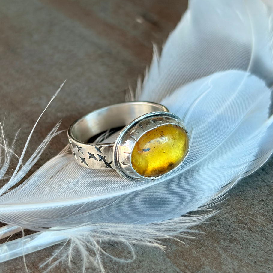 I call this bright sunny yellow Amber ring the Sunburst Ring. It is set with a bezel setting made to mimic the suns rays and sparkling stars along the wide sterling silver ring band. This sunny yellow Amber has multiple depths of small natural sediments within, leaving the majority of the stone shining its bright sunny glow.