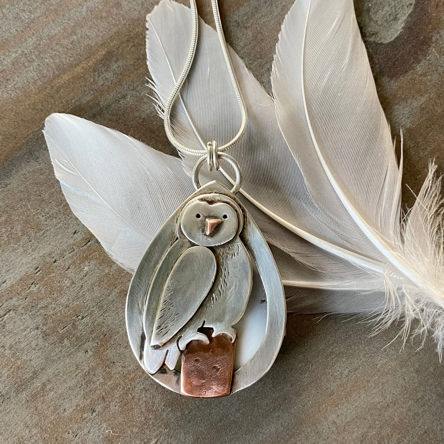 Each piece is hand drawn on paper then imposed onto my silver sheet which is cut by hand with tiny jewellers saws. Sometimes several layers are soldered together to create the imagery. Copper accents are used to create this tree stump the owl is perched onto, as well as his beak.