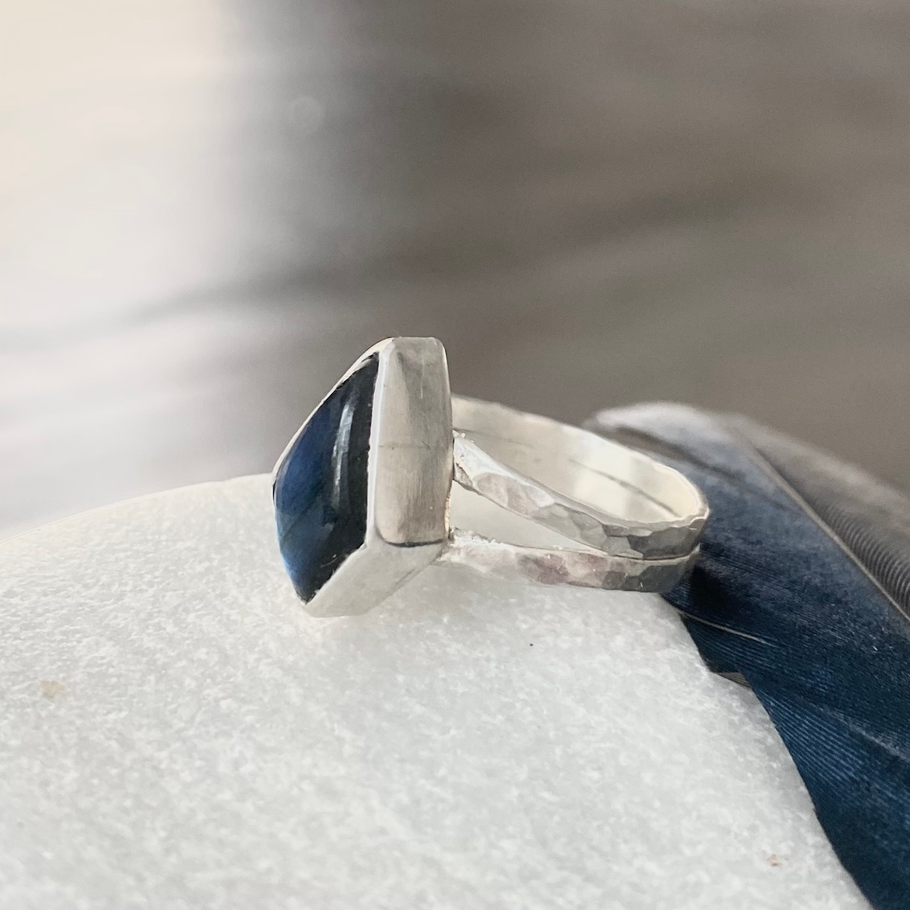 This one of a kind statement ring is handmade using silver smithing techniques with the bluest flash Labradorite gemstone with a smooth gemmy surface.