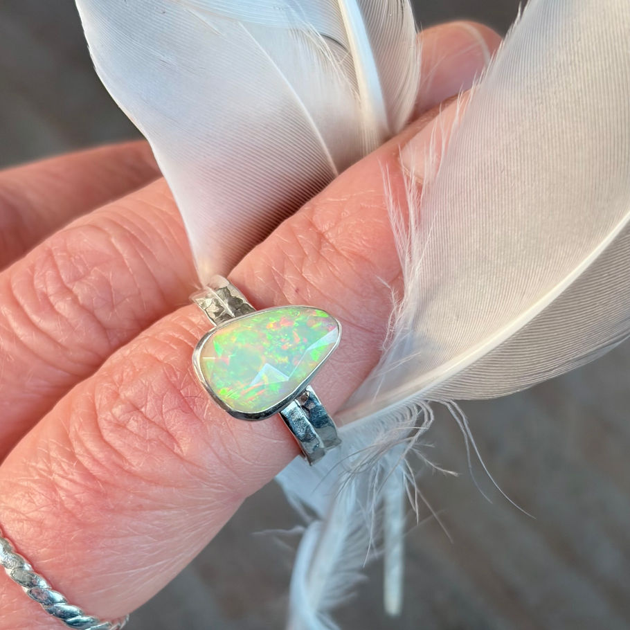 This Flashy Opal with rose cut surface has rainbow colours & lots of sparkle. Set with a bezel setting and onto a double hammer texture sterling silver band.