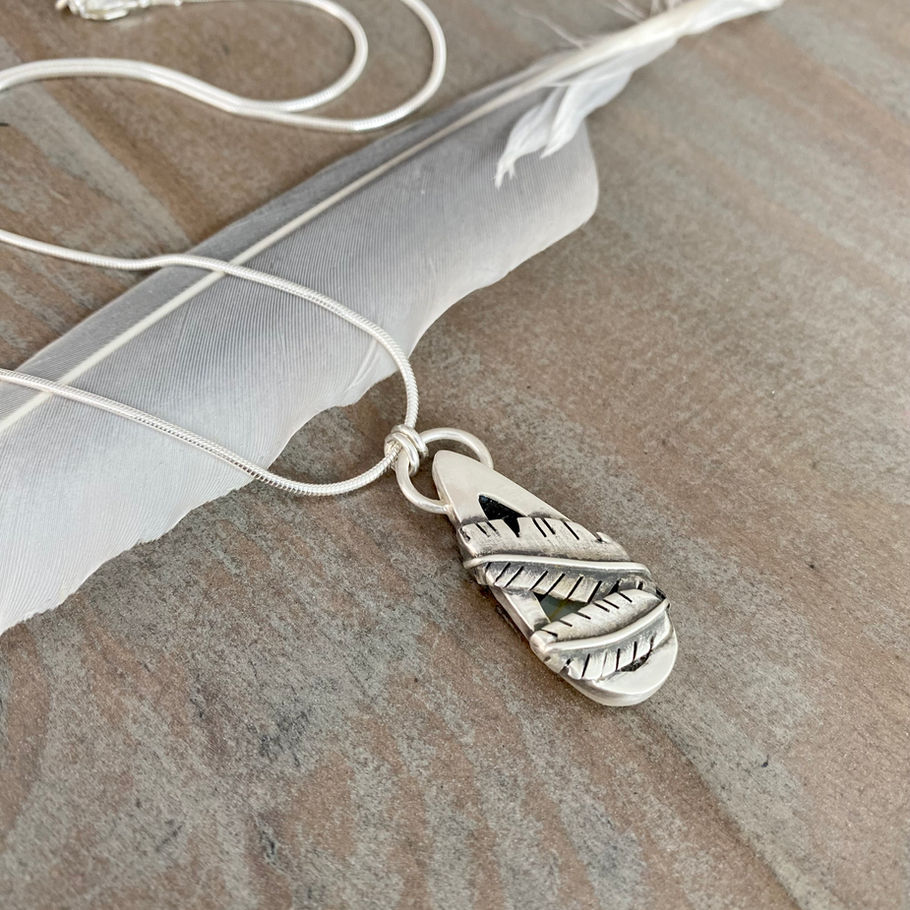 Pendant measures: 34mm tall x 13mm wide (including the bail)