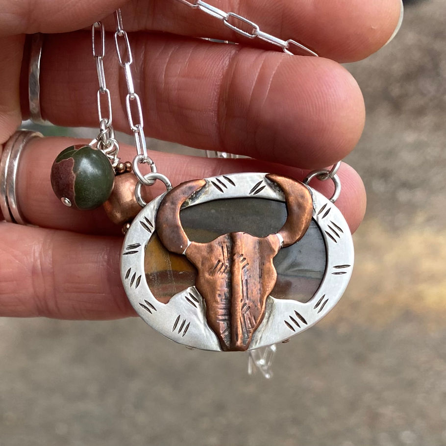 Textured copper, the bull skull stands alone in the desert, a symbol of freedom, resilience and protection.