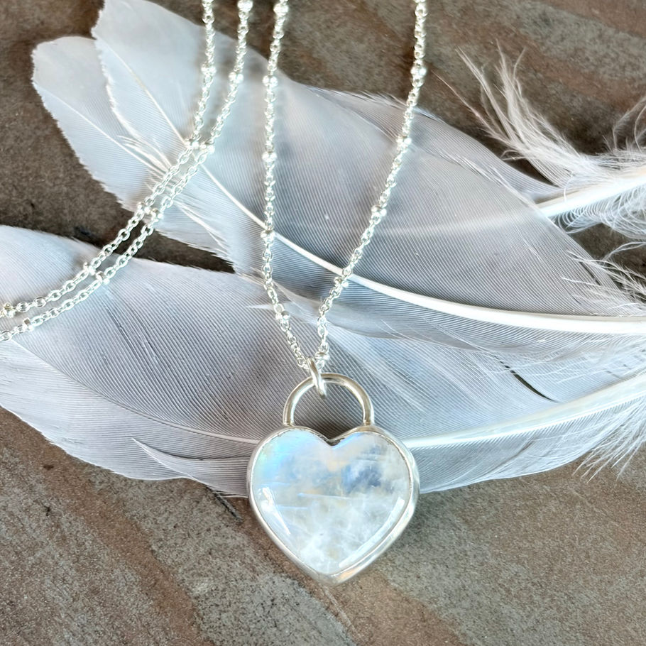African Rainbow Moonstone Sterling Silver Heart Necklace