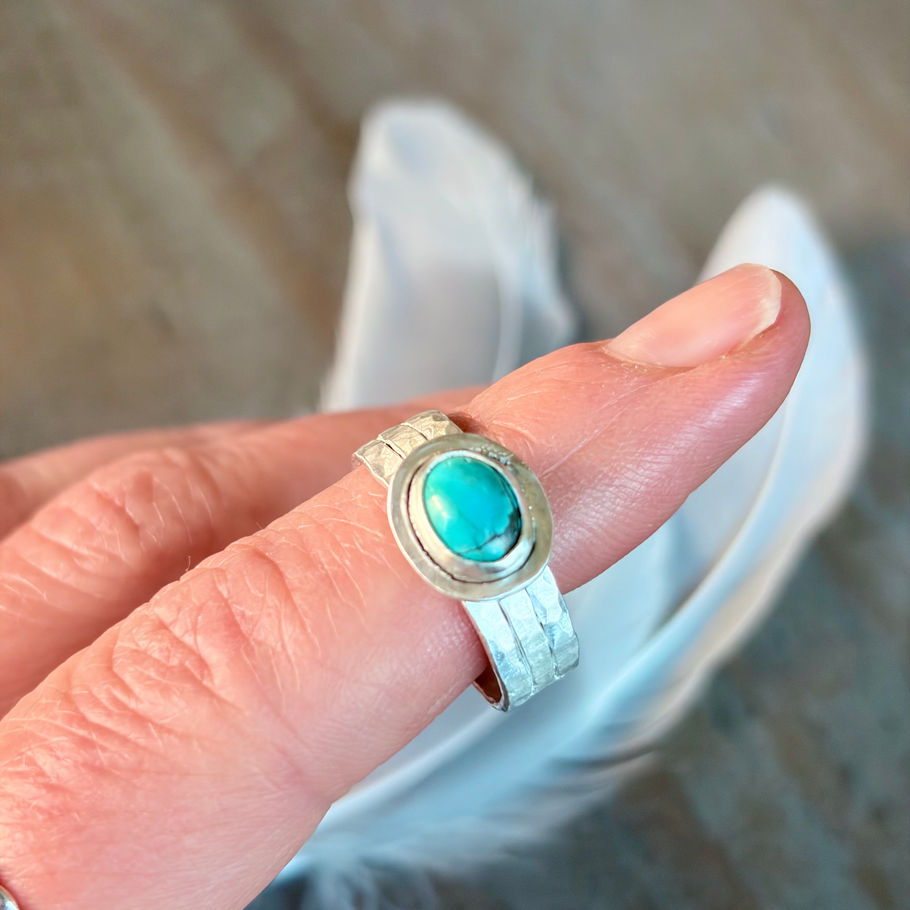 This Turquoise has just enough dark markings to make it interesting yet still has a gorgeous blue majority. Set with a bezel setting and a rough textured silver band around the gemstone with triple soldered hammer texture sterling silver ring bands to make a total width of a 6mm band.