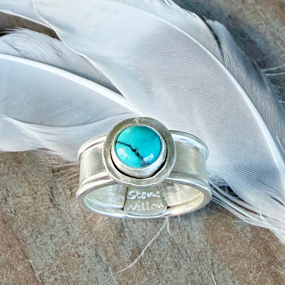 This round Turquoise is set with a bezel setting and a rough textured silver band around the gemstone with thicker sterling silver ring band made. Satin finish for the middle band and higher lipped polished sides to create a more substantial feel at 8mm wide.