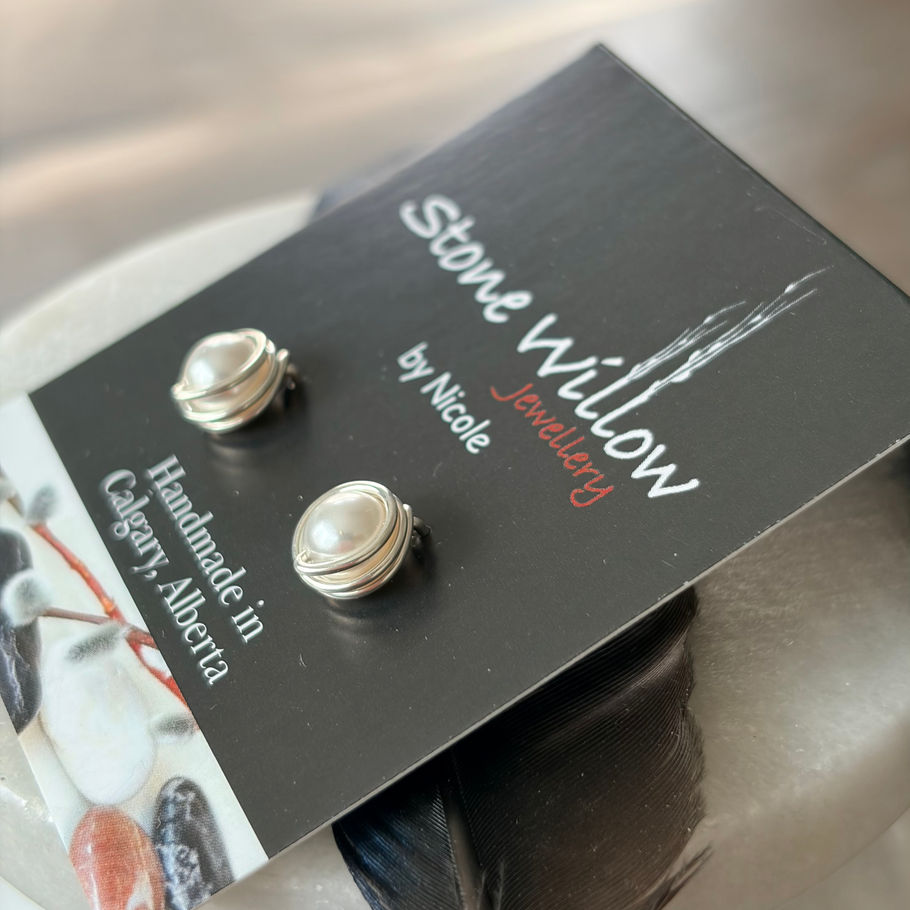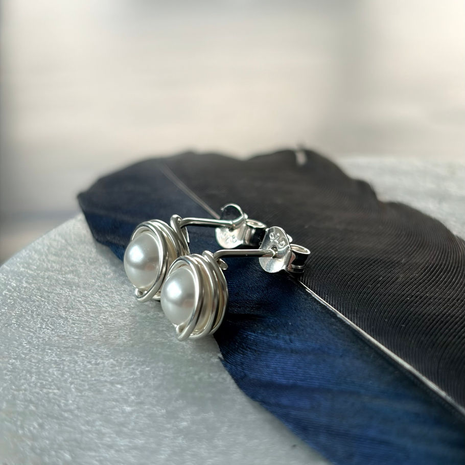 These dainty Swarovski Pearls are wrapped with love and sterling silver wire. On the back is a sterling silver butterfly clutch. Lovingly made by hand.